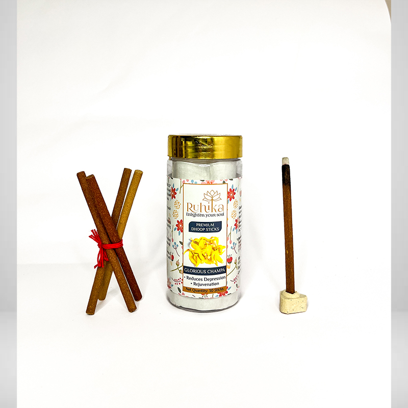 Glorious Champa Dhoop carries the heavenly aroma of the champa (Plumeria) flower, often used in temple rituals. Its fragrance is sweet, honey-like, and floral, with a creamy undertone that soothes the senses. Champa incense is traditionally used in Indian spiritual practices to invoke divine blessings and purify the mind. In Ayurveda, champa is believed to uplift mood, promote relaxation, and bring mental clarity. Lighting Glorious Champa Dhoop during poojas and meditation enhances the devotional ambiance, transforming any space into a temple-like atmosphere. It is a fragrance of purity, devotion, and spiritual awakening.