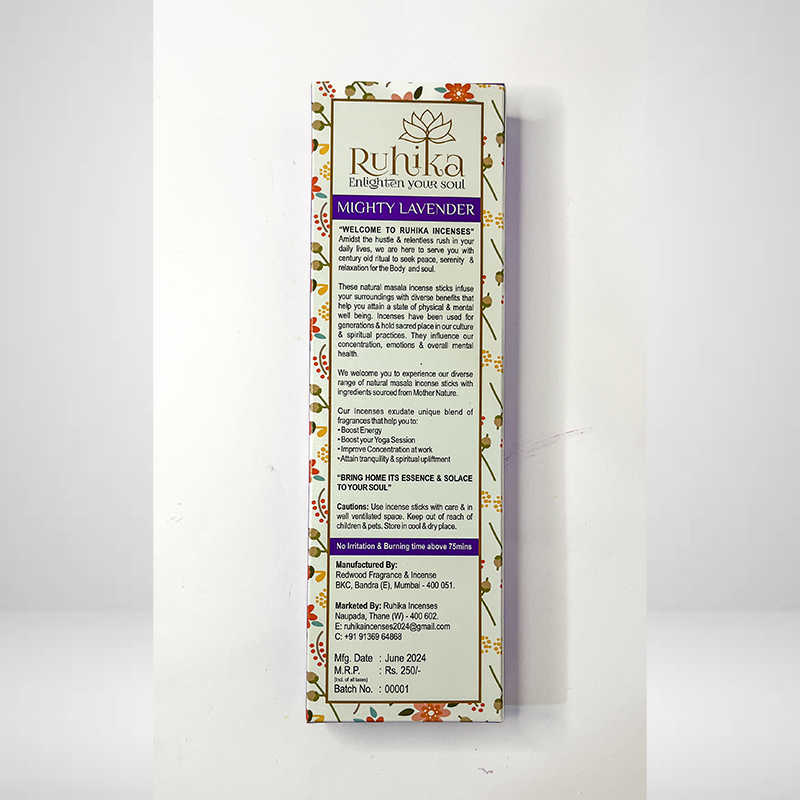 Mighty Lavender is a soothing, floral incense that embodies calmness, purity, and healing. Sourced from the gentle lavender blossoms known for their delicate fragrance, this incense opens with sweet floral notes blended with soft herbal undertones. Lavender has long been cherished in aromatherapy for its ability to reduce stress, improve sleep quality, and refresh the spirit. The fragrance works as a natural relaxant, easing tension in the body and mind while uplifting the soul. In Indian culture, lavender is often associated with purity and peace, making it a beautiful addition to both meditation practices and daily rituals. Lighting Mighty Lavender incense fills your home with a sense of balance, inviting positivity and calm energy into your surroundings. It is particularly beneficial after a long day, helping to release fatigue and encourage restful sleep. For spiritual seekers, lavender represents tranquility and divine grace, aligning with the higher self during meditation and prayer. Whether used in a pooja room, bedroom, or meditation corner, Mighty Lavender creates an oasis of serenity where the mind feels light, the heart feels calm, and the soul feels renewed.